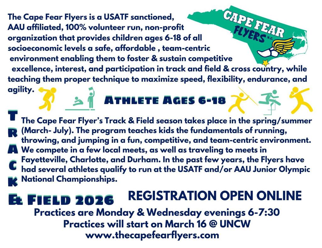 3) Do you or someone you have a business that would like to sponsor our club this year? Do you know someone who might like to sponsor the club? Please email us at info@thecapefearflyers.com and we will send out the sponsorship information or fill out the registration below.